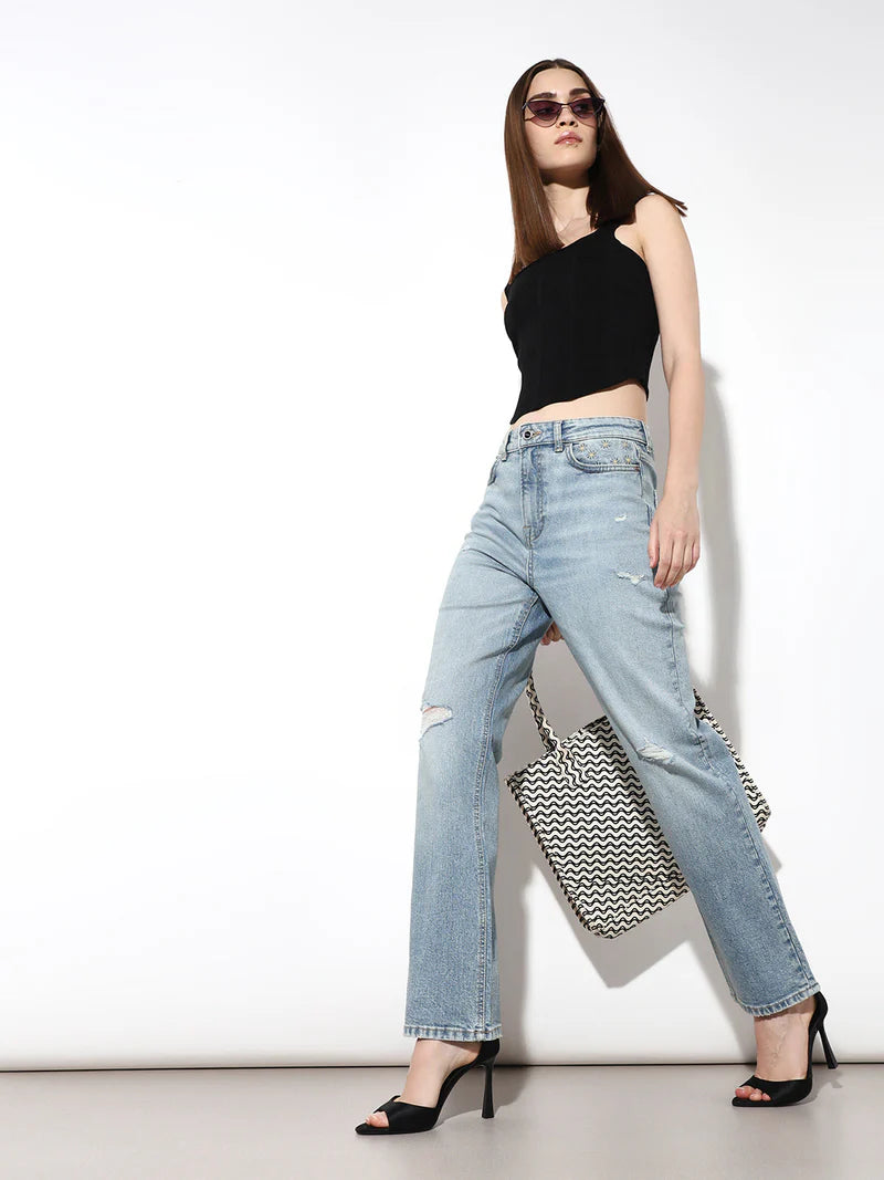 Women’s Light Blue Mildly Distressed Straight Fit Denim Pants for Everyday Outfits